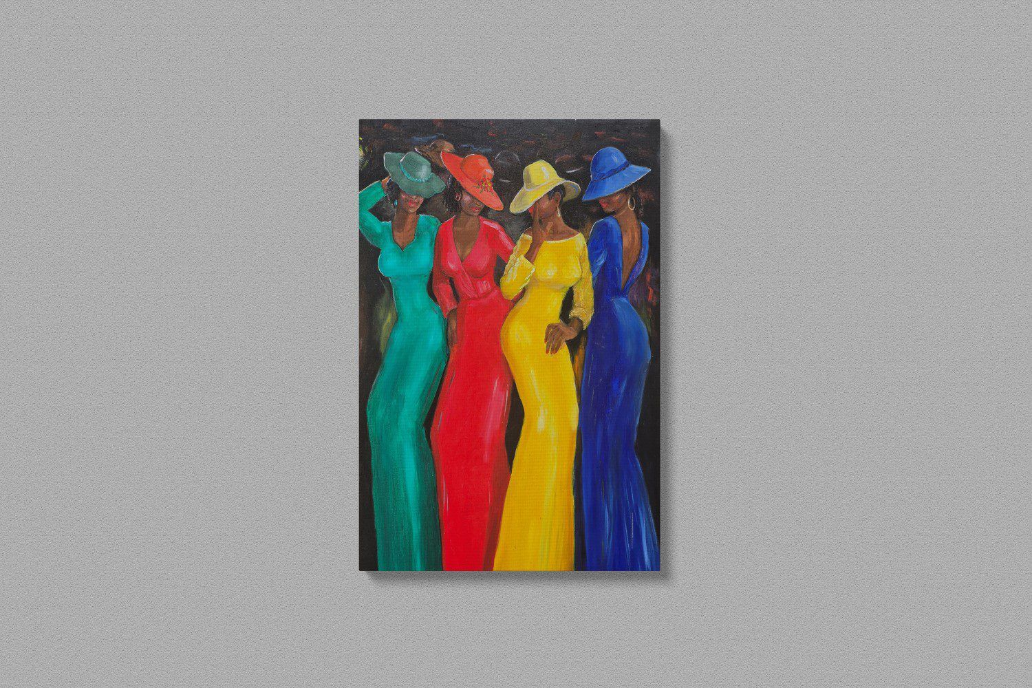 The artist masterfully blends contemporary realism with impressionistic brushstrokes, allowing the colors and textures to create a sense of movement and depth. The dark, abstract background accentuates the figures, making their presence even more commanding. This artwork embodies celebration, style, and empowerment, making it a perfect statement piece for collectors who appreciate bold, fashion-forward figurative art.
