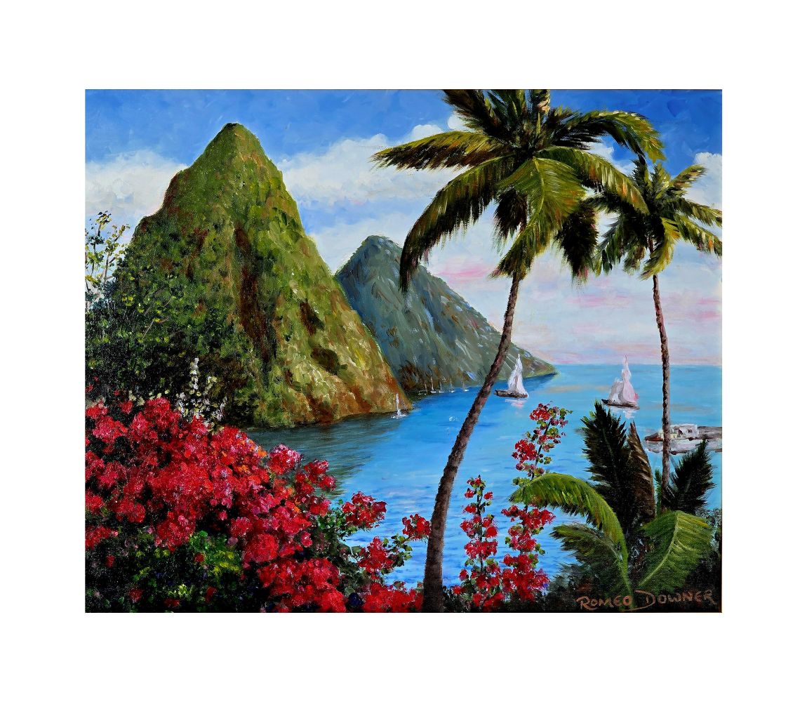 With rich, textured oil strokes, this piece brings to life the lush greens of Gros Piton and Petit Piton, contrasted by the deep blues of the Caribbean Sea and the warm glow of the tropical sky. The impasto technique adds depth and movement, evoking the feeling of standing at the edge of paradise, where the waves whisper against the shore and the mountains stand as silent sentinels of time.
