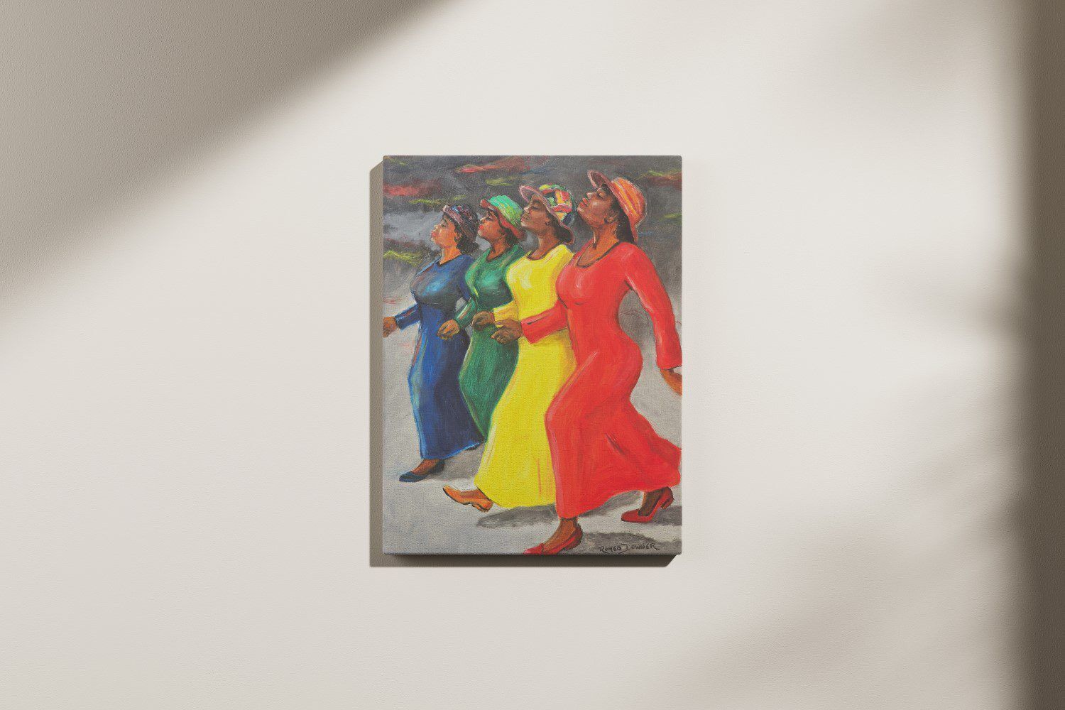 The fluidity of their poses and the rhythmic motion captured in the brushstrokes convey a sense of unity and shared joy. This one-of-a-kind piece embodies the exuberance and communal energy of Caribbean celebrations, making it a captivating addition to any art collection that appreciates vibrant, culturally inspired art.